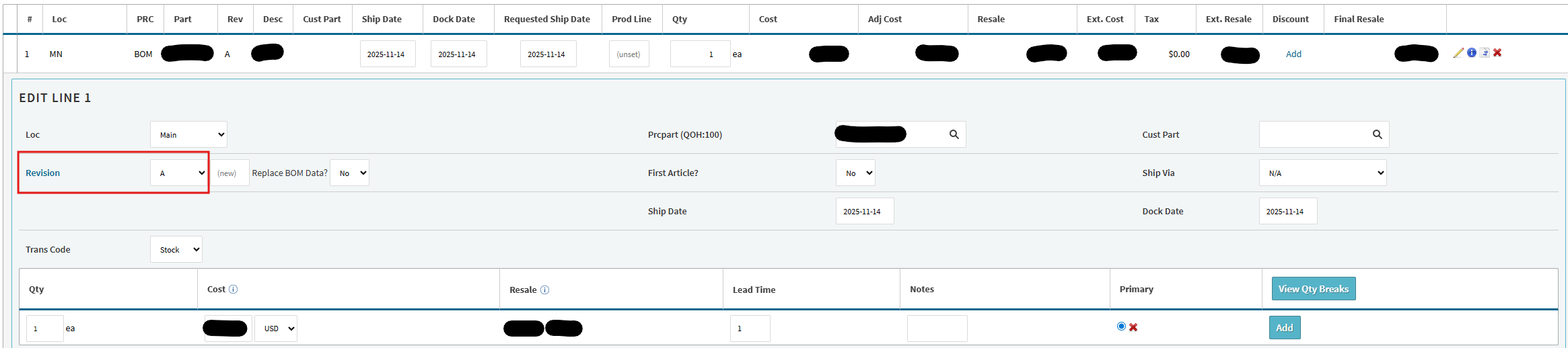 So even though the salesperson selected Revision A for Customer B, after committing the quote to an order, the system overwrites it with the BOM from the current revision.