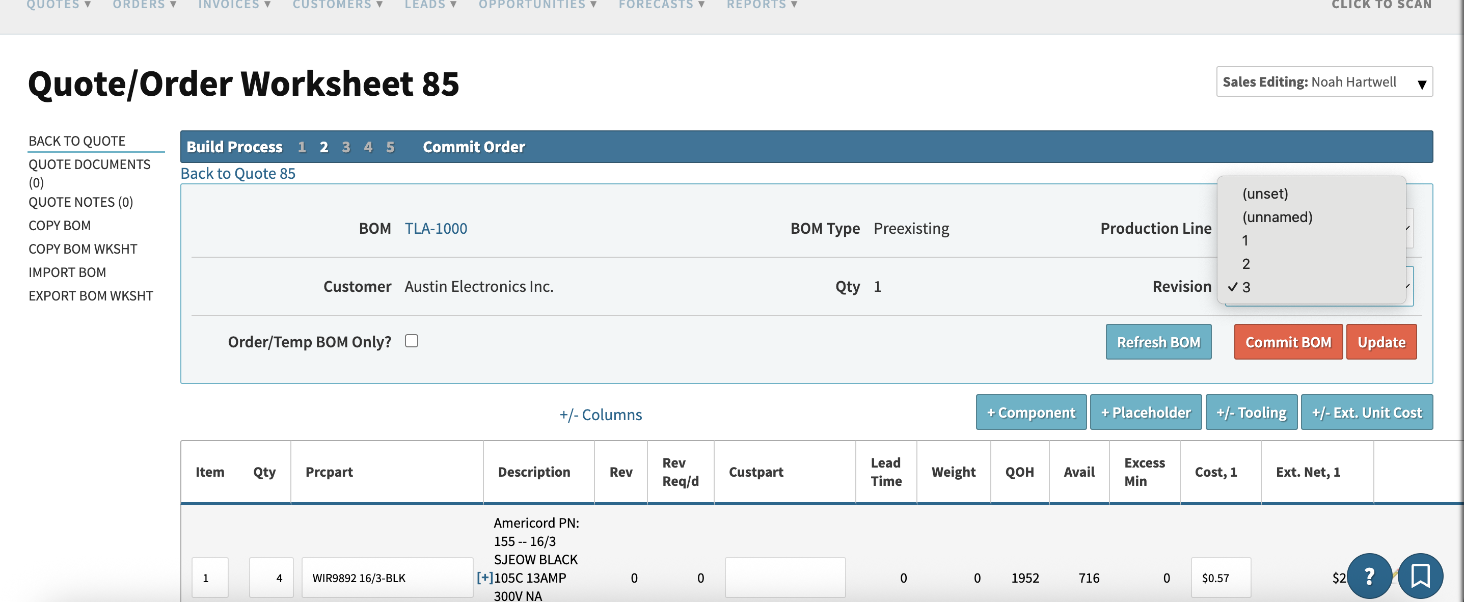 Essentially, the gist of my recommendation is to use the BOM Worksheet, or our estimating tool to quote your assemblies that fall within this scenario of a slightly different version or revision for an existing BOM. This feature is exactly what this was written for. Using the BOM Worksheet allows for changes and updates of a permanent BOM record to only affect the associated order/customer.