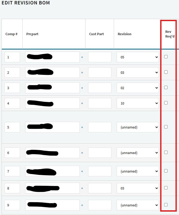 Under “Edit Revision-BOM”, you will need to select the ‘REV REQD’ checkbox for Components whose ‘REV’ you want to enforce the system to Pick and NOT default to the current Rev.