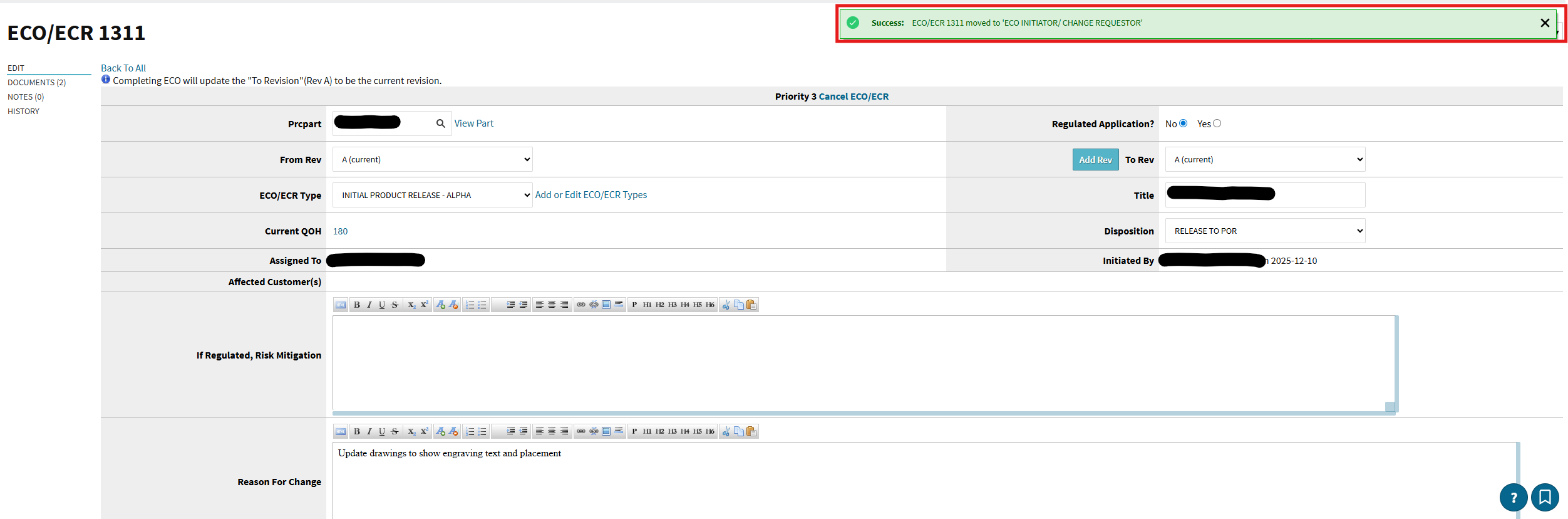 We have been trying to Move TWO ECOs (#1310 & #1311) to the next ‘Reviewer’ for Approval and when we select the reviewer from the drop-down and click the Button, the ECO just gets re-routed back to the ‘ECO Initiator’