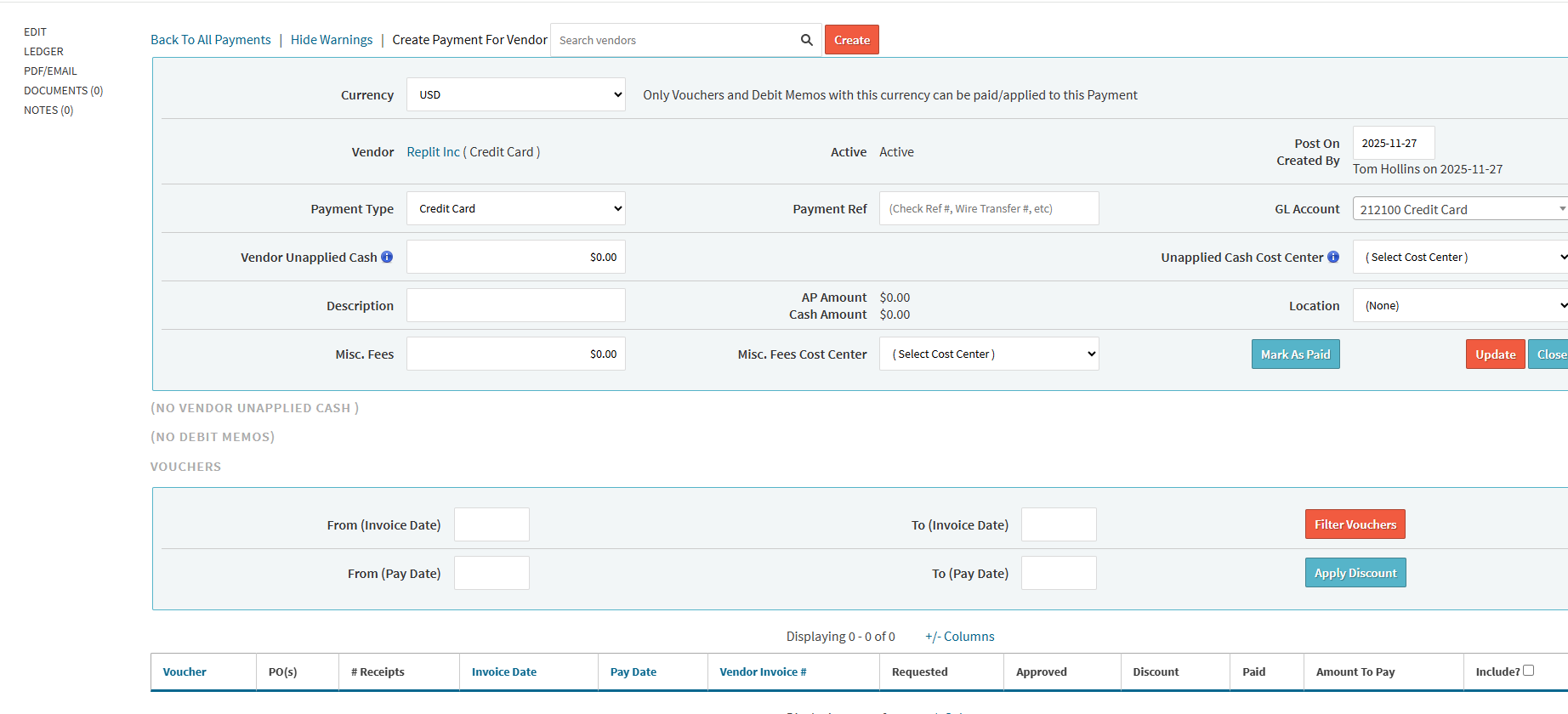 I have been successfully able to enter an invoice in USD. However when I create a payment for that vendor and select USD, the invoice does not show to pay. The vendor in question is Replit and the invoice is AIGXKO-00008 for $537.68 USD.