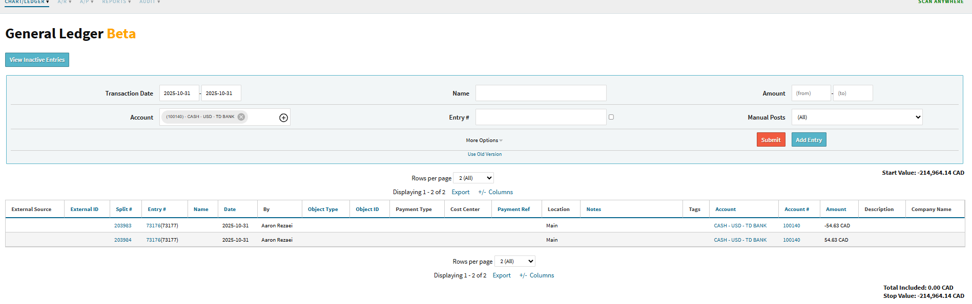 When I search the ledger for entries between 4.62 and 4.64 CAD, from Oct 1, 2025 - Oct 31, 2025, I only see three entries in that range, and each of those entries is for account 100240.
