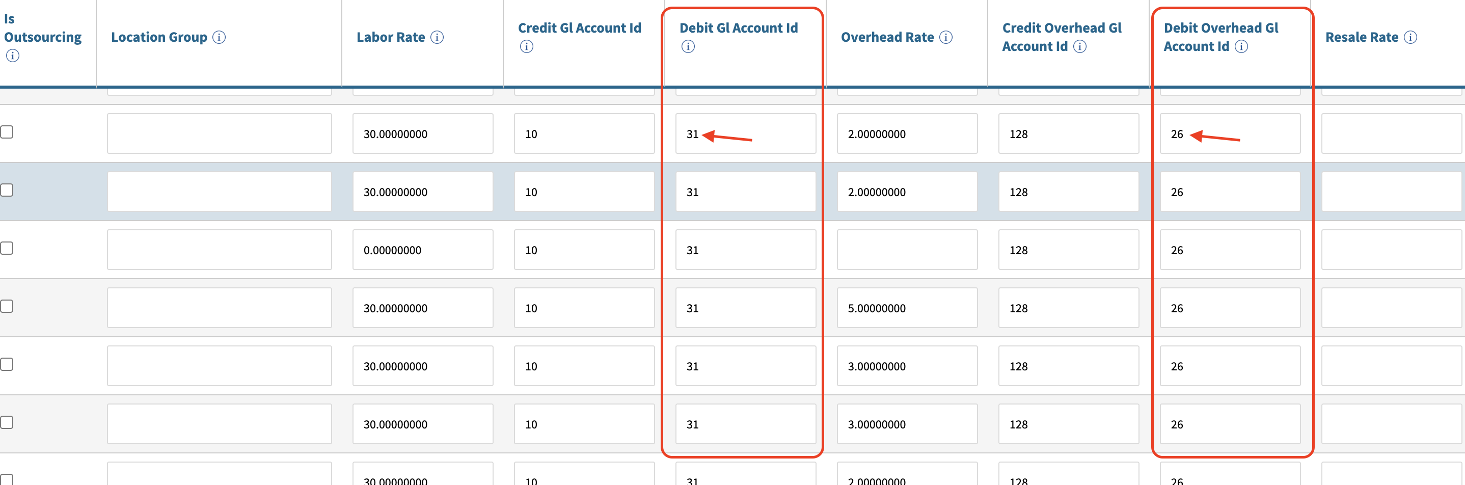 Notice the columns for GL debits… you have those set to debit account IDs 31 (for labor) and 26 (for overhead)