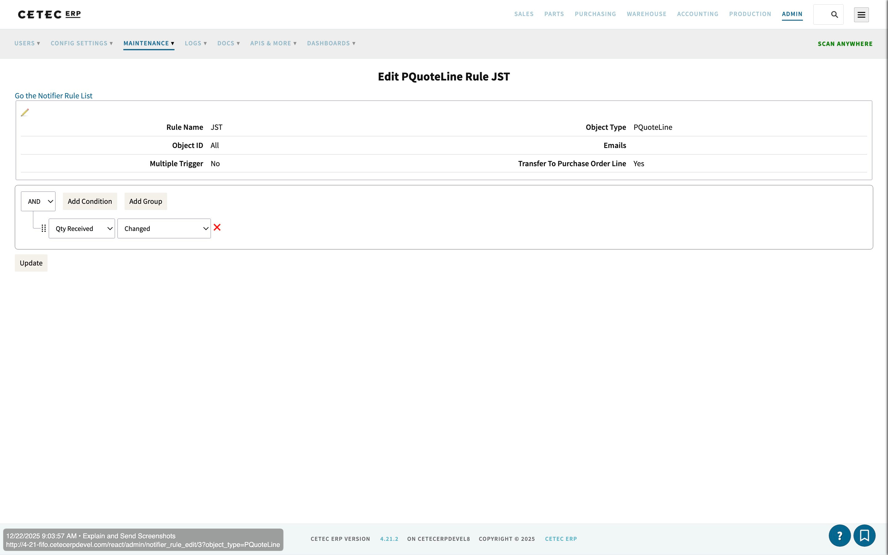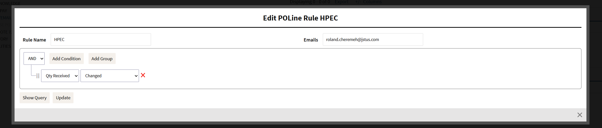 Here’s how I set up the PO Notifier for you to be set at the PQuote level. Feel free to copy and paste these conditions into your Beta.