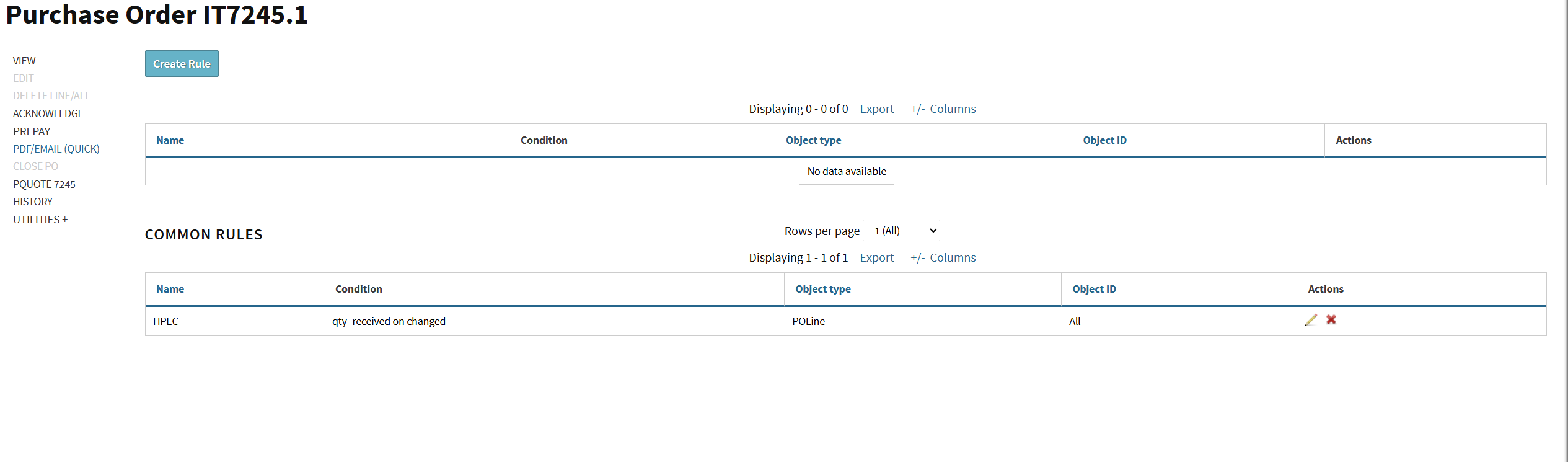 There’s also a newer, more contextual way to get to these now. From within an object record (like a PO or PQuote), go to Utilities and you’ll see Notifier Rules there. This view shows rules that apply specifically to that object as well as any global rules, and you can create new rules directly from this page too. Functionally it’s the same thing, just scoped to the object you’re looking at.