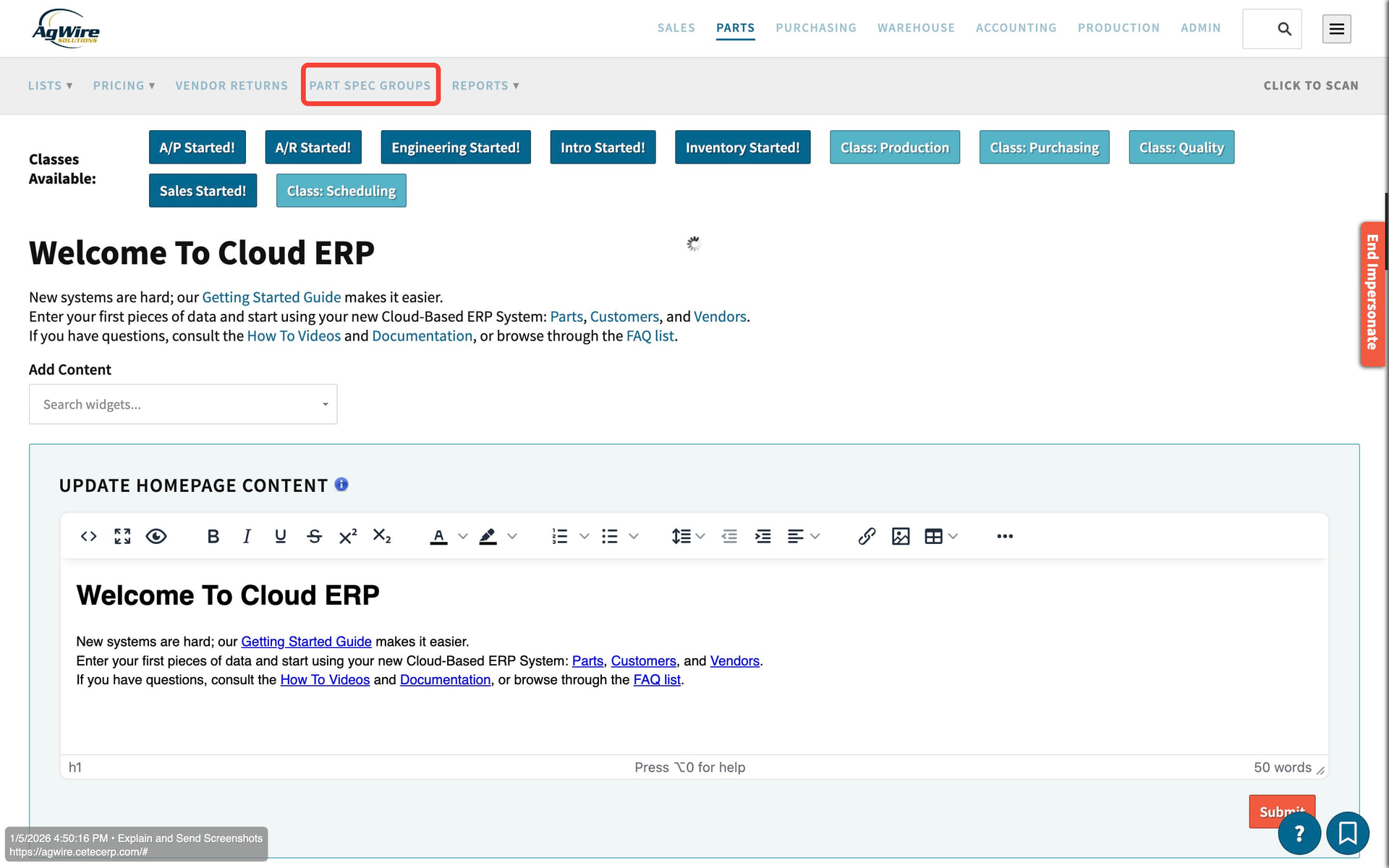 Hi, I am look utilize Parts Spec Groups but I do not see this option listed. See screen shot below after I have selected “Parts”. Does this need to be enabled somewhere? Thanks!