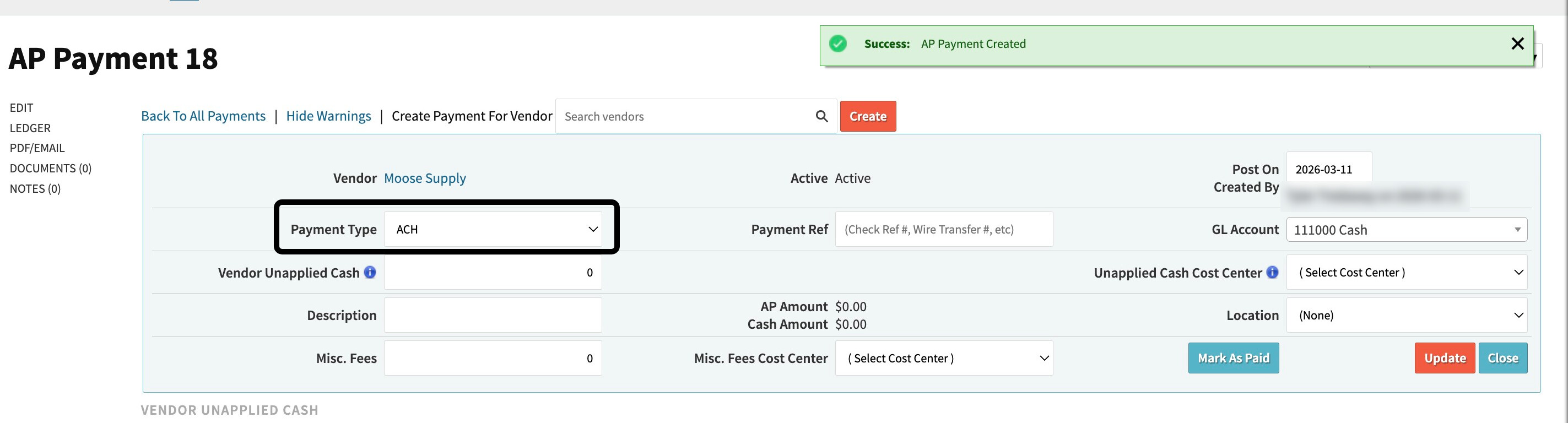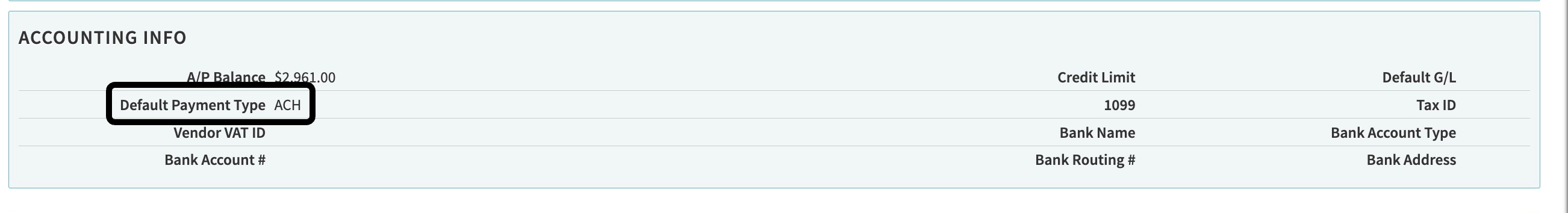 I’ve worked through associating a default payment type to a vendor record (ACH):