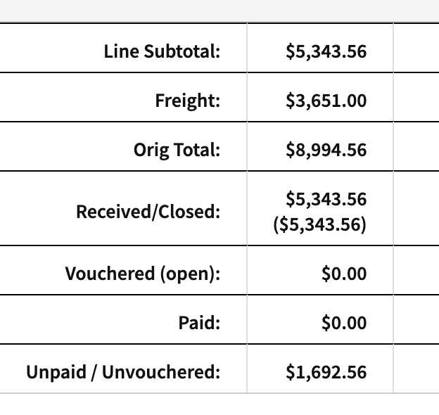 Happens on every single one. Here’s one that has been paid and the unpaid/unvouchered is a negative number that is the double of the freight costs.