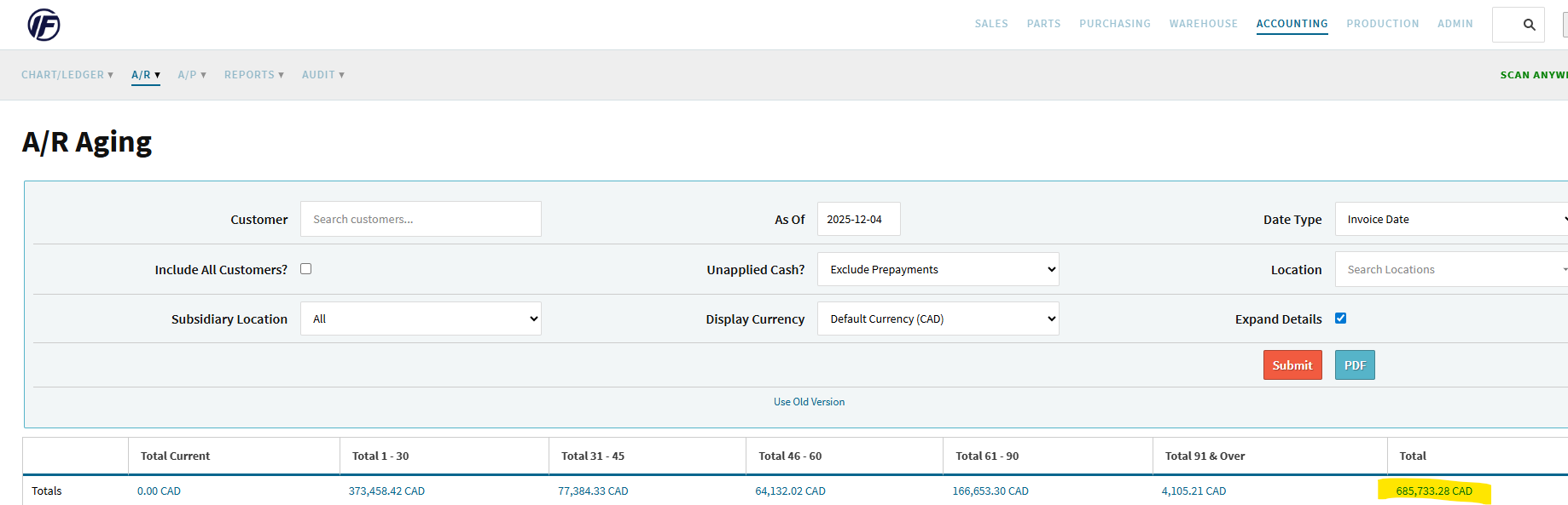 However if I click on the balance total (highlighted above) , it pulls up an A/R aging screen. If I run that report it generates a report showing the Aged AR totaling $685,733.28. My current G/L value is $684,349.04, so this is much closer.