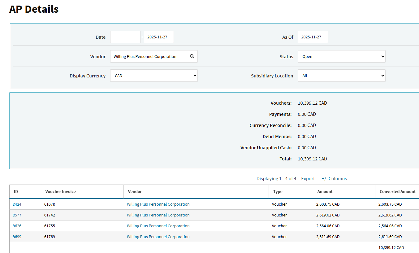 If I create an AP payment (for example 5076) for Willing Plus, invoices that have already been paid populate again. In this case Inv 61583 ($1.309.82), Inv 61599 ($1047.85), Inv 61647 ($2603.75) and Inv 61663 (2357.62). Other vendors may be effected. We are still checking. The AP details in CAD appears to be correct (see below). However when I select USD it shows two of the invoices translated.